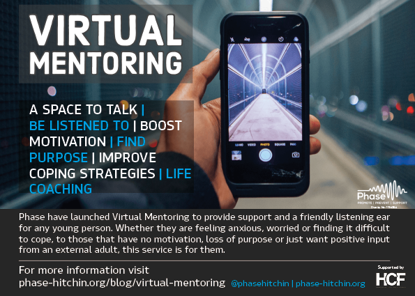 If you feel that you or someone you know would benefit from mentoring from Phase at the moment please download our information leaflet which explains our virtual mentoring in more detail, or you can also email support@phase-hitchin.org for more information or to discuss mentoring further. Or if you would be interested in exploring more about what being a mentor looks like do get in touch. We would love to hear from you.
